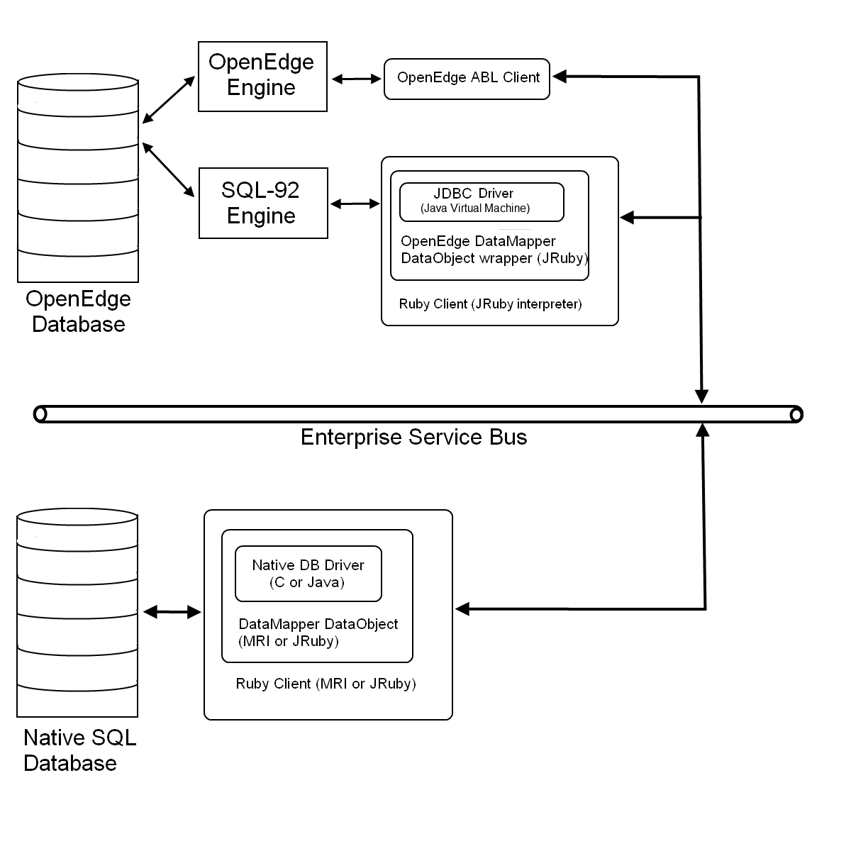 As DataMapper objects begin to mature, and subsystems become fully “Ruby-ized”, it would be prudent to move their data to a native SQL database in order to speed up the data access. Holding the data in a native Progress/OpenEdge database will undoubtedly be a little slower due to the OpenEdge to SQL conversions that the SQL-92 engine has to make in real-time. Note that programs can still talk to eachother, even though they are using different databases, by using an ESB (e.g. a JMS like ActiveMQ). Also note that the migrated Ruby code does not require a JDBC driver anymore; it could be ran on the native C Ruby interpreter (MRI) for instance, assuming MRI DataObject wrappers are available for the new database.
