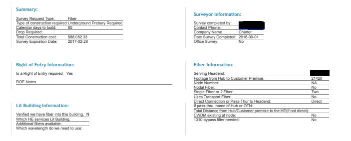 My first stab in the dark was in late 2016 when I contacted Charter (now Spectrum) to give me an estimate on what it would cost to get a fiber connection to my parents’ house. Some months later they responded with a site survey that described the cost to connect to their nearest “lit building” (a building with lit fiber access), which would require 12,500 feet of outside plant fiber, would come in at $88,082.33!8