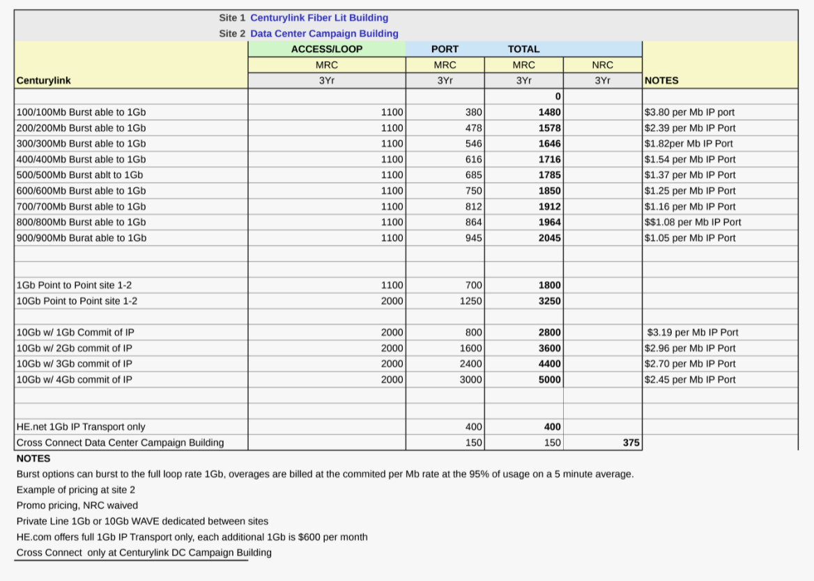 From the quotes I got back, for a 500Mbps/500Mbps symmetric circuit with Centurylink, it would have costed $1,785 per month with a three-year commitment.